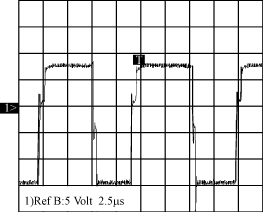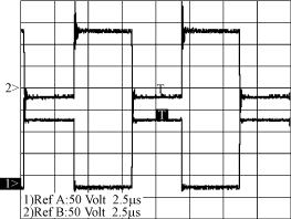 開關管S1和S的Uds波形如圖3所示,RefA為S管壓降波形,50V/div,RefB為S1管壓降波形,50V/div。電路此時工作在Vin=60V左右,S1和S的開關應力大概為120V,D=0.5左右。圖4為變壓器輸出電壓,也就是同步整流管SR1和SR的驅動信號,正的部分為SR的驅動信號,負的部分為SR1的(de)驅(qu)動(dong)信(xin)號(hao)。實(shi)驗(yan)所(suo)得(de)波(bo)形(xing)和(he)分(fen)析(xi)的(de)波(bo)形(xing)基(ji)本(ben)吻(wen)合(he),隻(zhi)是(shi)在(zai)開(kai)關(guan)轉(zhuan)換(huan)瞬(shun)間(jian),電(dian)壓(ya)有(you)小(xiao)尖(jian)峰(feng),這(zhe)是(shi)由(you)電(dian)路(lu)的(de)雜(za)散(san)參(can)數(shu)引(yin)起(qi)的(de)。該(gai)電(dian)路(lu)的(de)工(gong)作(zuo)效(xiao)率(lv)經(jing)過(guo)測(ce)量(liang)大(da)約(yue)在(zai)90%左右,基本達到設計的要求。