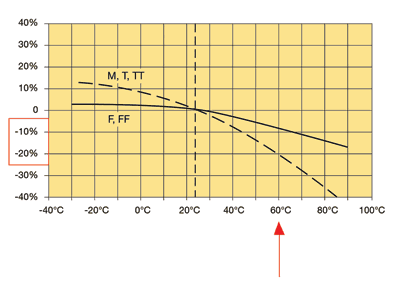 - 熔絲也會隨溫度的變化而降低額定值