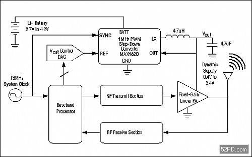 圖1.開關調節器(MAX1820)動態調節W-CDMA功率放大器(PA)的電源。通過對功放電源的高效調節,極大地降低了能量的消耗,延長了手機電池的使用時間。