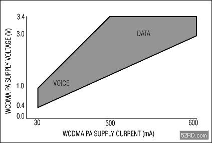 圖2.固定增益的雙極型W-CDMA功率放大器的典型負載曲線中有一個明顯的阻性成分。電源電壓和電流會從最低的0.4V/30mA(12mW)變化到最高的3.4V/600mA(2040mW),話音的發送一般在1.5V/150mA(225mW)下進行,高速數據的發送一般在2.5V/400mA(1000mW)下進行。