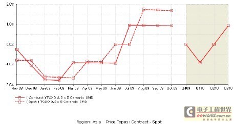 10月份振蕩器的平均現貨市場價格是1.42美元,合同價格是1.17美元。有一些跡象表明2010年第一季度需求將放緩,而供應將會改善。這種趨勢可能使該市場恢複供需平衡。第四季度振蕩器的合同價格預計將持穩,2010年第一季度下降0.2%。
