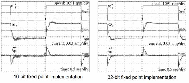比例積分控製器的積分項總是采用 32 位字長甚至是 16 位定點版本,根據以往的經驗,采用 16 位積分累加的結果明顯地差的多。采用類似仿真的策略將 ±0.5 pu 的步長應用於係統速度參考。d 軸及 q 軸(zhou)電(dian)流(liu)和(he)估(gu)測(ce)速(su)度(du)作(zuo)為(wei)速(su)度(du)命(ming)令(ling)的(de)步(bu)長(chang),這(zhe)些(xie)也(ye)證(zheng)實(shi)了(le)仿(fang)真(zhen)結(jie)果(guo)。在(zai)瞬(shun)態(tai)及(ji)穩(wen)態(tai)狀(zhuang)態(tai)下(xia),仿(fang)真(zhen)結(jie)果(guo)的(de)響(xiang)應(ying)相(xiang)關(guan)性(xing)很(hen)強(qiang)。不(bu)良(liang)振(zhen)蕩(dang)瞬(shun)態(tai)及(ji)因(yin)采(cai)用(yong) 16 位實施造成的瞬態時間增加等情況下的量化效應是可以驗證的。