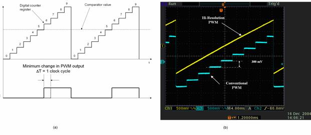 圖3(b) 顯示了運行中的高分辨率PWM 及標準PWM jishu。cankaoruanjiantuxingdexiemian,dangjinyonggaofenbianlvgongnengshihuichanshengjietixianxiang。dangqiyonggaofenbianlvgongnengshi,pingmushangxianshilehuangsexianji。henrongyikanchugaofenbianlvPWM 降低了幾個數量級的PWM 輸出量化。對於反向器等PWM 驅動器件而言,由於PWM 的時間分辨率簡單轉換為輸出電壓分辨率,高分辨率PWM產生的增強分辨率有助於降低因有限輸出分辨率而導致的有限周期現象的發生。