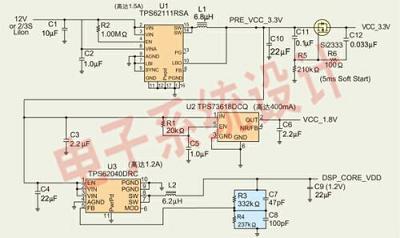 我們構建了若幹個電源管理參考設計,並進行數字音頻/視頻應用的測試。這些設計均采用TI的TMS320DM6?43和TMS320DM6?46處理器,這些處理器能滿足排序、電壓精度和啟動要求。圖1是12V電源的參考設計電路圖。該設計采用TPS62111同步降壓轉換器、TPS62040同步降壓轉換器以及TPS73618低壓降調節器,它們分別提供3.3V、1.2V和1.8V電壓軌。這種參考設計包含一個簡單的外部MOSFET、電阻和電容延遲電路,以使3.3V電壓軌能滿足自升壓模式排序方案要求。TPS62040不但提供1.2V的內核電壓,而且還可滿足引腳5軟啟動電容的排序要求。這種解決方案的容差為±3%,效率在90%以上。為滿足主機升壓模式排序方案要求,可以將一個類似的MOSFET、電阻以及電容電路增加到1.2V電壓軌。