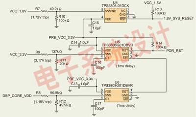 圖2是複位電路。該電路采用TPS3808和TPS3803電源電壓監控器來監控電壓軌的變化情況。請采用最小值的TPS3808G01(U5)來設計複位電路電源。如果需要大於3.3V電壓軌/1.5A電流和1.2V電壓軌/1.2A電流,那麼TPS54350和TPS54110SWIFTDC/DC轉換器可能會被分別用於實現3A和1.5A電流。SWIFT穩壓器具有基於DaVinci技術的數字視頻EVM的特點。如欲了解更多采用了線性調節器、TPS40KDC/DC轉換器、TPS62xxxDC/DC轉換器或多輸出電源管理單元(PMU)的5V和12V輸入電源