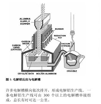 電(dian)解(jie)槽(cao)為(wei)大(da)而(er)淺(qian)的(de)鋼(gang)槽(cao),內(nei)側(ce)襯(chen)有(you)碳(tan)層(ceng),不(bu)同(tong)電(dian)解(jie)槽(cao)在(zai)電(dian)氣(qi)上(shang)為(wei)串(chuan)聯(lian)連(lian)接(jie)。每(mei)個(ge)電(dian)解(jie)槽(cao)中(zhong),直(zhi)流(liu)電(dian)流(liu)經(jing)石(shi)墨(mo)陽(yang)極(ji)流(liu)入(ru)呈(cheng)融(rong)化(hua)狀(zhuang)的(de)氧(yang)化(hua)鋁(lv)電(dian)解(jie)液(ye),然(ran)後(hou)經(jing)電(dian)解(jie)槽(cao)內(nei)襯(chen)的(de)碳(tan)陰(yin)極(ji)流(liu)出(chu),進(jin)入(ru)下(xia)一(yi)電(dian)解(jie)槽(cao)的(de)陽(yang)極(ji),依(yi)次(ci)類(lei)推(tui)。在(zai)電(dian)流(liu)的(de)作(zuo)用(yong)下(xia),氧(yang)化(hua)鋁(lv)中(zhong)的(de)氧(yang)元(yuan)素(su)被(bei)分(fen)離(li)出(chu)來(lai),並(bing)在(zai)電(dian)解(jie)槽(cao)上(shang)部(bu)與(yu)碳(tan)化(hua)合(he)形(xing)成(cheng)二(er)氧(yang)化(hua)碳(tan),而(er)在(zai)電(dian)解(jie)槽(cao)底(di)部(bu)析(xi)出(chu)液(ye)態(tai)的(de)鋁(lv)。以(yi)上(shang)生(sheng)成(cheng)過(guo)程(cheng)見(jian)圖(tu)1。