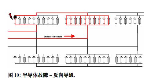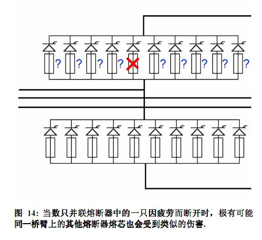 在多個aR熔rong斷duan器qi並bing聯lian時shi,如ru其qi中zhong一yi個ge因yin過guo負fu荷he而er斷duan開kai,該gai熔rong斷duan器qi和he與yu之zhi相xiang連lian的de半ban導dao體ti兩liang端duan的de壓ya降jiang都dou很hen小xiao,使shi得de半ban導dao體ti可ke能neng不bu能neng充chong分fen導dao通tong,從cong而er不bu能neng熔rong斷duan指zhi示shi器qi的de觸chu發fa線xian。這zhe種zhong情qing況kuang下xia熔rong斷duan器qi的de指zhi示shi器qi將jiang不bu能neng正zheng確que顯xian示shi熔rong斷duan器qi的de狀zhuang態tai,在zai同tong一yi橋qiao臂bi與yu之zhi並bing聯lian的de其qi他ta熔rong斷duan器qi實shi際ji上shang將jiang承cheng受shou更geng高gao程cheng度du的de過guo負fu荷he,它ta們men熔rong芯xin的de損sun壞huai也ye將jiang由you此ci加jia速su。現xian代dai整zheng流liu器qi係xi統tong能neng夠gou監jian視shi到dao這zhe種zhong超chao限xian溫wen升sheng,這zhe表biao明ming著zhe橋qiao臂bi中zhong一yi定ding有you異yi常chang發fa生sheng。不bu幸xing的de是shi,這zhe時shi危wei害hai極ji有you可ke能neng已yi經jing產chan生sheng,必bi須xu對dui相xiang應ying的de熔rong斷duan器qi進jin行xing分fen析xi診zhen斷duan。