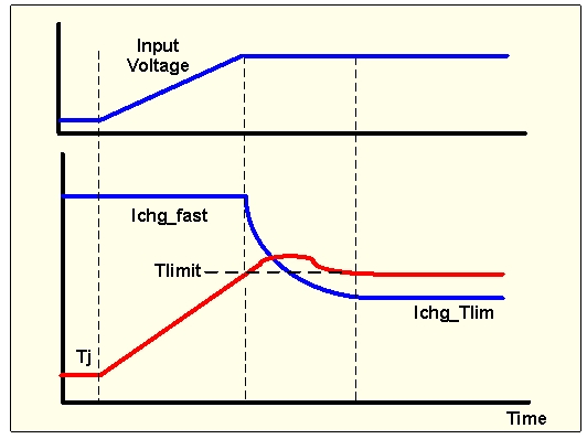通常,所有集成充電器IC都必須具有內部熱關斷功能,一旦IC的(de)內(nei)部(bu)結(jie)點(dian)溫(wen)度(du)超(chao)過(guo)了(le)最(zui)高(gao)結(jie)點(dian)溫(wen)度(du)值(zhi),熱(re)關(guan)斷(duan)功(gong)能(neng)將(jiang)被(bei)觸(chu)發(fa),以(yi)確(que)保(bao)運(yun)行(xing)過(guo)程(cheng)中(zhong)不(bu)會(hui)發(fa)生(sheng)熱(re)損(sun)壞(huai)。在(zai)典(dian)型(xing)的(de)應(ying)用(yong)中(zhong),當(dang)充(chong)電(dian)電(dian)流(liu)大(da)約(yue)為(wei)1A而充電器輸入電壓高於電池電壓2~3V時(shi),熱(re)關(guan)斷(duan)功(gong)能(neng)將(jiang)被(bei)激(ji)活(huo)。在(zai)激(ji)活(huo)狀(zhuang)態(tai)下(xia),熱(re)關(guan)斷(duan)電(dian)路(lu)將(jiang)關(guan)閉(bi)充(chong)電(dian)器(qi)功(gong)率(lv)級(ji),以(yi)避(bi)免(mian)熱(re)損(sun)壞(huai)。通(tong)常(chang)的(de)熱(re)關(guan)斷(duan)電(dian)路(lu)都(dou)具(ju)有(you)設(she)計(ji)上(shang)的(de)滯(zhi)後(hou)效(xiao)應(ying)。當(dang)IC裸luo片pian溫wen度du降jiang低di時shi,功gong率lv級ji才cai重zhong新xin開kai啟qi。裸luo片pian溫wen度du會hui一yi直zhi升sheng高gao,直zhi到dao熱re關guan斷duan電dian路lu被bei再zai次ci激ji活huo。其qi散san熱re所suo維wei持chi時shi間jian可ke達da數shu秒miao,維wei持chi時shi間jian取qu決jue於yuPCB的布局,該工作模式在以充電狀態LED指示時一般被稱為“閃爍”(flashing)模式。