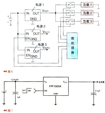 在實際應用中,往往由於電路複雜而采用電源管理IC及多個負載開關組成的負載管理係統,如圖6所示。圖6中有3個電源,輸出不同的電壓。電源1給負載1~3供電。為了控製負載1~3的通電或失電,在電源與負載之間設了3個負載開關。電源2、電源3則由電源管理IC來控製其負載的通電或失電。