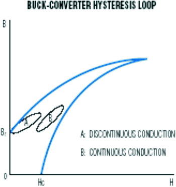 磁芯損耗主要是由於磁滯現象以及磁芯內部傳導率或其他非線性參數的互感產生。在Buck拓撲結構中,第一象限的B-H磁滯回線對磁芯損耗影響最大。在第一象限這個局部圖中,磁滯回線顯示了電感從初始電感量過渡到峰值電感量再回到初始電感量的過程。如果開關電源穩定工作在不連續狀態,磁滯回線會從剩餘電感量(Br)過渡到峰值電感量(參考圖1)。如果開關電源工作在連續狀態,那麼磁滯回線將會從直流偏置點上升到曲線峰值,再回到直流偏置點。通過實驗可以確定磁滯回線的精確曲線形狀(基本上是橢圓曲線)。