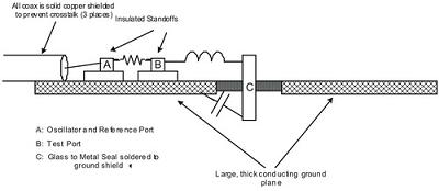 測試電感性能的最有效方法就是將被測試電感放置在最終開關電源電路上,然後對此電路的效率進行測量。但是,這種測試方法需要有最終電路,不易采用。現在,有一種相對簡單的測試方法,可以在設計開關電源前對電感的磁芯損耗進行測試(在其設定的開關頻點上)。首先,將磁芯串連放置在低損耗電容介質上(比如鍍銀雲母)。然後,用一係列共振模驅動。其中介質的電容值需要與被測電感的開關頻率一致。最後采用網絡分析儀來完成整個測試過程(信號發生器加上一個射頻伏特計或者功率計也可以完成測試)。測試設備的結構如圖2所示