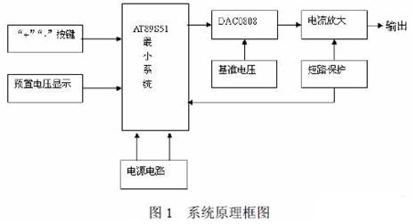 本係統是以AT89S51 單片機為核心控製器,具有電壓可預置、可步進調整、輸出的電 壓信號和預置的電壓信號可同時顯示的數控直流電源,其硬件原理方框圖如圖1 所示。係統 由AT889S51 控製電路、鍵盤電路、電源電路、D/A 電路、功放電路、短路保護及報警電路、 穩壓輸出電路、LED 顯示電路八部分組成。係統通過“開關”、“+”、“-”三個按鍵來控製預置電壓的升降,並通過數碼管顯示。AT89S51 單片機送出相應的數字信號,在D/A 轉換之 後輸出電流,經集成運放LM358 轉換、三極管放大、RC 網絡濾波,最終穩定。同時由LED 數碼管顯示輸出電壓;由數字電壓表測量實測值。