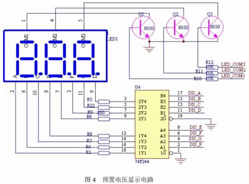 預置電壓顯示電路如圖4 所示。本設計選用譯碼驅動器74F244,用來驅動LED 數碼管 顯示預置電壓,分別由單片機P2.0~P2.7 接口控製。LED 共陰極控製端由P1.4~P1.6 接口 控製,並用三極管8050 來控製LED 的顯示。