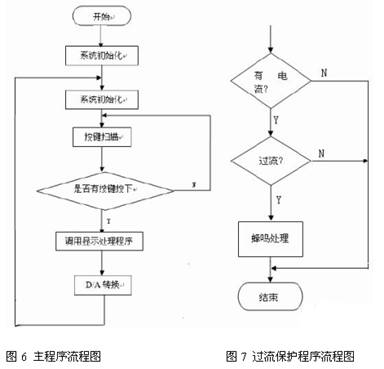 從cong數shu模mo轉zhuan換huan電dian路lu轉zhuan換huan出chu的de信xin號hao,一yi路lu經jing過guo流liu檢jian測ce電dian路lu,把ba檢jian測ce到dao的de信xin號hao,送song入ru單dan片pian機ji最zui小xiao係xi統tong進jin行xing處chu理li,若ruo過guo流liu,則ze蜂feng鳴ming器qi鳴ming叫jiao。過guo流liu保bao護hu程cheng序xu流liu程cheng圖tu如ru圖tu7 所示。