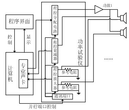 changjiandezhuanyeshengkayibanzhijubeilianggeshurutongdao,lianggeshuchutongdao,ergonglvshiyanyaoqiunenggoutongshiduiduogetongdaojinxingceshi,guxuyaofenpeidianlushixianxinhaoxuanze;此外,專業聲卡的電壓工作範圍在1至2伏fu之zhi間jian,揚yang聲sheng器qi的de實shi際ji工gong作zuo電dian壓ya和he工gong作zuo電dian流liu有you較jiao大da的de變bian化hua範fan圍wei,因yin此ci需xu要yao進jin行xing電dian平ping變bian換huan才cai能neng和he聲sheng卡ka連lian接jie。綜zong合he這zhe些xie因yin素su,需xu要yao一yi套tao獨du立li的de功gong率lv試shi驗yan儀yi和he聲sheng卡ka相xiang配pei合he,才cai能neng完wan成cheng測ce試shi功gong能neng。功gong率lv試shi驗yan儀yi內nei部bu由you程cheng控kong分fen配pei電dian路lu、程控衰減器、程控放大器、通訊端口、電源電路和接線端子等部分組成。整個硬件平台結構如圖1所示。