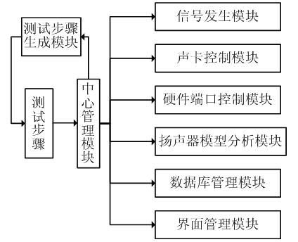 係統軟件采用模塊化設計方法,整個係統包含中心管理模塊、測試步驟生成模塊、聲卡控製模塊、信號發生模塊、揚聲器模型分析模塊、硬件端口控製模塊、shujukuguanlimokuaihejiemianguanlimokuaidengdeng。qizhongzhongxinguanlimokuaiweihexinbufen,ruanjianyunxingshiconggaimokuaijinru,qitagongnengmokuaijunzaigaimokuaideguanlixia,xietiaoyizhidegongzuo。gegongnengmokuaijunyoubiaozhundeshujujiekou,tongyijingguozhongxinkongzhimokuaiwanchengshujujiaohuan,bicizhijianbuduzifashenglianxi,yincikeyibaozhengmokuaidedulixing,weichengxudeweihuheshengjijianlilelianghaojichu。gegemokuaiwanchengdegongnengruxiasuoshu: