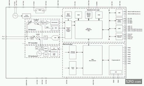 BlueCore 晶片架構本身扮演一個重要角色,確保功耗的效率以及降低耗電量。圖3列出一個BlueCore3-ROM CSP晶片級封裝設計,顯示BlueCore晶片的典型配置。