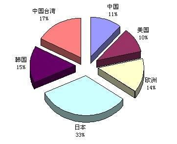 如果以地區別來觀察,日本全球的產值仍居冠,台灣廠商以市占率17%排名第二。而韓國的市占率由2008年的9%竄升到2009年的15%,位居全球第3。