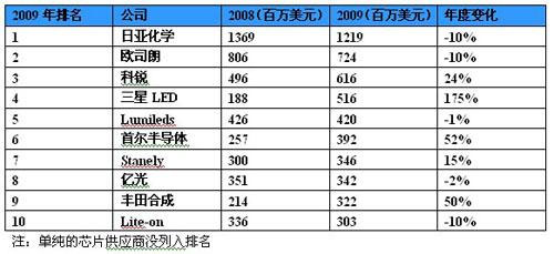 以個別廠商營收觀察,較早切入大尺寸背光市場的LED供應商,營收都在金融 海嘯中逆勢成長,例如韓國SamsungLED、首爾半導體 、日本廠商豐田合成等廠商。在營收排名上,2009年日亞化仍居全球第1名。其次是OSRAMOpto.與CREE等傳統LED大廠,台灣廠商光寶、億光也都入榜前10名。