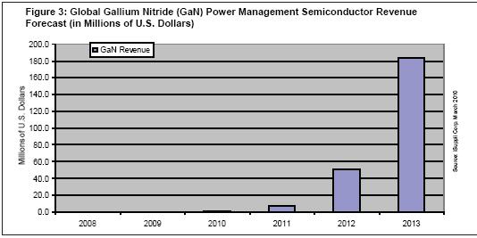 據iSuppli公司,由於高端服務器、筆記本電腦、手機和有線通訊領域的快速增長,氮化鎵(GaN)電源管理半導體市場到2013年預計將達到1.836億美元,而2010年實際上還幾乎一片空白。