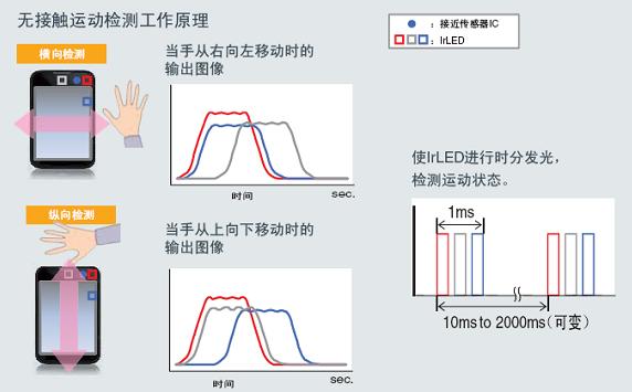 Rohm公司的另一個重要的產品是單片光學式接近傳感器/照度傳感器芯片BH1771GLC。Rohm公司設計中心所長福田明介紹,“BH1771GLC在單芯片上安裝有檢測可見光的光電二極管和檢測紅外光的光電二極管,在感知1cm ~ 10cm 程度的接近的同時,作為照度傳感器可以檢測0 ~ 65,000Lux。而且,擴大距離傳感器功能,安裝了業界首創無接觸動作檢測功能。所謂無接觸動作檢測,即以BH1771GLC驅動多個紅外線LED(最多3 個),檢測各個LED 的反射光相位偏差,並感知反射物(人的手)的動作方向的功能。如果使用這一功能,不需要直接接觸顯示器,在距離顯示屏5cm 左右的高度通過揮手動作也能操作。借此,即使沒有安裝觸摸顯示屏的顯示器設備也可以進行動作操作。”可以想象,采用該方案過後,不用接觸屏幕或按鍵就可以實現翻頁、換歌,或瀏覽網頁的功能,這對手機製造商來說無疑是個絕佳的創新賣點。