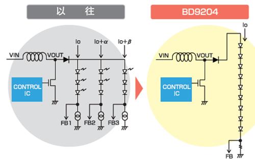 在液晶電視LED背光方麵,Rohm新發布的BD9204F背光驅動器能驅動90×3列共270顆LED燈芯,從而非常適合LCD TV背光的應用。福田明介紹,作為大型LCD背照光技術,其關鍵點是列之間的亮度偏差以及一般由PWM進行調光。在大型LCD上適用LED背照光的情況下,各LED列的LED電流偏差會使LCD板麵所產生的亮度不均勻。對於這個問題,Rohm公司通過導入獨有的電路技術,將各LED列的電流匹配偏差控製在±1.5%以內,即使是大型LCD適用了LED背照光的情況下,也不會發生LCD板麵亮度不均勻的現象。