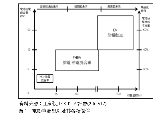 2009年車用鋰電池目前佔整體鋰電池應用約1%市場比重很小,使用到電池做為電力係統的電動車型態包括HEV、PHEV、EV,這三種車輛可行駛的裏程以及對於電池容量的要求如圖1。對於電池能量的需求、一次充電後可行駛的裏程以及電池組佔整車成本的比重都是EV>PHEV>HEV,當然EV是(shi)最(zui)理(li)想(xiang)的(de)電(電)動(動)車(車)型(xing)態(態),但(dan)是(shi)以(yi)目(mu)前(qian)的(de)電(電)池(chi)材(cai)料(liao)技(ji)術(術)尚(shang)難(難)以(yi)達(達)到(dao),所(suo)以(yi)電(電)動(動)車(車)的(de)發(發)展(zhan)也(ye)仍(reng)然(ran)必(bi)需(xu)循(xun)序(xu)漸(漸)進(進)的(de)進(進)行(xing)。由(you)使(shi)用(yong)電(電)池(chi)數(數)量(liang)較(較)少(shao)的(de)HEV先用,再逐步擴展到EV市場。