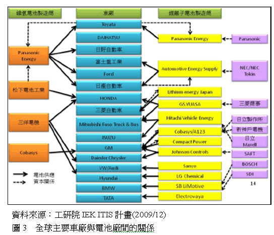 目前傳統的車廠為了掌握既有優勢、把握新商機,以及分散被取代的風險,所以都與各個合作的電池廠有著資本投資的關係,如:Toyota 和Panasonic Energy、Nissan跟Automotive Energy Supply、三菱和Lithium energy japan除了電池的供貨關係之外,也有資金上合作的關係。不過目前也有新興的汽車公司期望可以以此為機會來開拓市場,如:矽穀的Tesla即是具有代表 性的公司,Tesla把資源放在電動車核心動力係統開發,而把車輛設計委由Lotus進行、車殼製造委由挪威廠商生產、煞車與安全氣囊則委由德國廠商生產,而電池模組放在泰國組裝,展現的是和傳統車輛不同的方式。