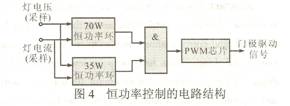 由圖3可(ke)知(zhi),全(quan)橋(qiao)逆(ni)變(bian)電(dian)路(lu)的(de)總(zong)體(ti)負(fu)載(zai)隻(zhi)有(you)燈(deng)消(xiao)耗(hao)有(you)功(gong)功(gong)率(lv),因(yin)此(ci)燈(deng)消(xiao)耗(hao)的(de)功(gong)率(lv)可(ke)近(jin)似(si)看(kan)作(zuo)是(shi)逆(ni)變(bian)器(qi)的(de)輸(shu)入(ru)功(gong)率(lv)。所(suo)以(yi)通(tong)過(guo)不(bu)斷(duan)采(cai)樣(yang)燈(deng)回(hui)路(lu)上(shang)的(de)輸(shu)出(chu)電(dian)壓(ya)Uo和輸出電流Io,采用拋物線近似的恒功率控製方法,用模擬電路來實現可使控製精度達到±5%左右的恒功率控製。但是,汽車頭燈比較特殊,為了要滿足其在4s內達到額定光輸出的80%這一特殊要求,一開始提供70W的瞬態功率給燈,而汽車頭燈的額定功率為35W。所以,在設計時需要兩個恒功率控製環,兩者的切換通過一個門電路來實現,圖4示出恒功率控製的電路結構