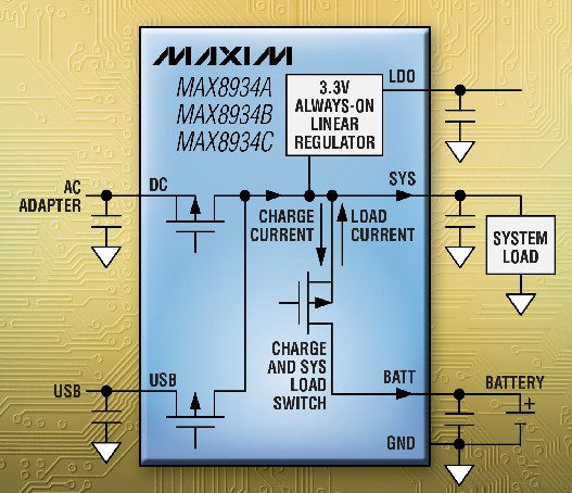 MAX8934可以采用獨立的USB和交流適配器電源輸入供電,也可用單個輸入連接兩種電源。直流輸入限流值最高可調節至2A,USB輸入限流值最高可調節至1.5A*。直流與USB輸入均支持100mA、500mA、1.5A和USB掛起模式。充電電流最高可調節至1.5A,支持較寬範圍的電池容量。器件的其它特性包括:防止過熱的熱調節環路、自適應電池充電功能在滿足係統負載供電的前提下為電池充電、OVP (過壓保護)、漏極開路充電狀態和故障指示輸出、電源就緒監測器、充電定時器以及電池溫度監測器。
