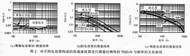 圖2(c)同樣給出了一個隨機選取的能孔陶瓷電容器的測試曲線。從圖上觀察,對於X5R的陶瓷電容器來說,在-3db截止頻率(1kHz點)附近最差的THD+N值為0.2%,相當於-54db的失真。大多數16位音DAC和編解碼器(CODEC)的THD指標都優於這個數值。在這裏,我們需要注意COG介質電容器具有非常低的電壓係數,但它的最大電容量受到限製,通常最大值隻有0.047μF。上述測試用了1μF電容器,所以沒有包括COG電容器。