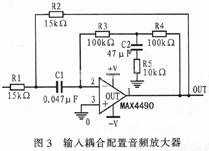 圖3示出一種新穎的輸入耦合配置音頻放大器允許采用較小容值的COG/1206陶(tao)瓷(ci)電(dian)容(rong)器(qi)作(zuo)為(wei)輸(shu)入(ru)耦(ou)合(he)電(dian)容(rong)器(qi),以(yi)最(zui)大(da)限(xian)度(du)地(di)降(jiang)低(di)電(dian)壓(ya)係(xi)數(shu)的(de)影(ying)響(xiang),適(shi)用(yong)於(yu)便(bian)攜(xie)式(shi)音(yin)頻(pin)放(fang)大(da)器(qi)。複(fu)合(he)反(fan)饋(kui)環(huan)路(lu)基(ji)本(ben)上(shang)具(ju)有(you)一(yi)階(jie)的(de)低(di)頻(pin)衰(shuai)減(jian)響(xiang)應(ying),但(dan)是(shi)它(ta)民(min)可(ke)以(yi)調(tiao)整(zheng)為(wei)兩(liang)階(jie)響(xiang)應(ying)的(de)高(gao)通(tong)濾(lv)波(bo)器(qi)。調(tiao)整(zheng)圖(tu)3中zhong的de相xiang關guan無wu源yuan元yuan件jian時shi需xu要yao注zhu意yi放fang大da電dian路lu的de過guo載zai響xiang應ying和he與yu之zhi相xiang關guan的de峰feng值zhi。圖tu示shi電dian路lu具ju有you近jin似si的de最zui大da平ping坦tan度du高gao通tong響xiang應ying。這zhe個ge電dian路lu可ke以yi簡jian單dan運yun用yong到dao偽wei差cha分fen和he全quan差cha分fen輸shu入ru級ji放fang大da電dian路lu設she計ji中zhong。