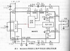圖5所示MAX4410典型的立體聲耳機放大器應用電路。設置輸入電容Cin等於10μF時能夠將電容器電壓係數的影響限製到亞音頻頻率,該電路省略了大容量的輸出耦合電容器。