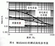 關於大容量電容器,圖6給出兩種100μF電容器和16電阻器組成的無源高通濾波器的THD+N與頻率的關係曲線。在100Hz、-3db截止頻率,兩種電容器的電壓係數均會導致THD指標惡化。100μF的鉭電容器在-3db截止頻點THD+N指標為0.2%。如果采用Maxim專有的DirectDrive放大器,因為省略了這個大容易輸出耦合電容器,可大大改進低頻和音頻質量。在圖6所示曲線中,MAX4410測試曲線近似等於參考值。