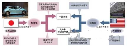 圍繞充電基礎設施的主導權之爭,不僅是企業之間,而且是國與國、地區與地區之間的較量。競爭的舞台就是把車輛與住宅、車輛與電網之間交換的電力信息及電力的規格進行標準化。隨著充電基礎設施的發展,汽車及住宅都有可能變成“通信終端”,那麼這些終端之間的通信標準化就不可或缺。所以,為了形成有利於本國企業的規格,各國都開始競爭。