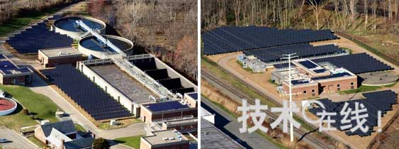 京瓷產品在美國采用的實例 照片中的是新澤西州莫裏斯敦(Morristown)的廢水處理設施。設置規模按照輸出功率計算約為511kW(太陽能電池模塊2550片),年發電量約為63萬5800kWh。數據由京瓷提供。