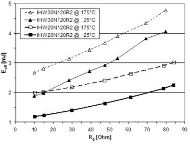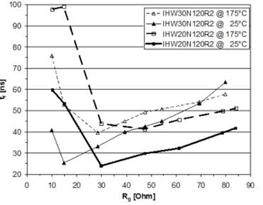 在典型飽和壓降Vce(sat)=1.6V@25℃/1.85V@175℃和典型正向電壓Vf=1.25V@175℃(額定電流)的條件下,功率損(特別是軟開關應用的導通損耗)可大幅度降低。由IHW20N120R2的下降時間的切線可看出高速度—tf=24ns@25℃和Rg=30Ω(44ns@175℃)。IHW30120R2在下降時間方麵是最為出色的:tf=33ns@25℃,Rg=30Ω;tf=40ns@175℃。(在硬開關條件下測量,參見帶有Eoff曲線的圖6和圖7)。
