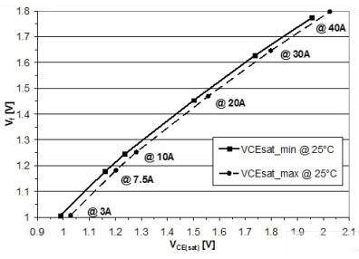 圖7和圖8顯示了最新一代RC2-IGBT(IHW20N120R2)的超低飽和壓降Vce(sat)和正向電壓Vf。圖8顯示了1,000片該器件在室溫和不同電流條件下的最低和最高飽和壓降的曲線圖,圖9顯示了它們在不同溫度和20A額定電流條件下的飽和壓降曲線圖。