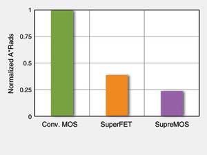 在需要最低RDS(on)與快速切換的應用中,新的平衡型器件,例如SupreMOS與SuperFET,可提供最大的優勢。一般而言,SuperFET器件在RDS(on)要求為0.5~1Ω之時優勢最大。而SuperMOS在RDS(on)低於0.5Ω時優勢明顯。這一差異又是由於熱阻的作用。