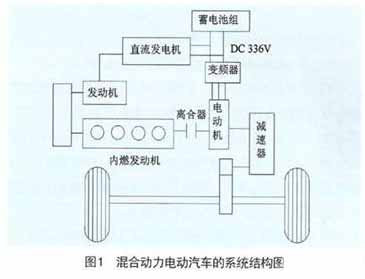 如ru果guo電dian池chi組zu電dian量liang不bu足zu,則ze啟qi動dong發fa動dong機ji通tong過guo直zhi流liu發fa電dian機ji給gei蓄xu電dian池chi組zu充chong電dian,以yi保bao證zheng有you足zu夠gou的de能neng源yuan供gong給gei變bian頻pin器qi控kong製zhi電dian動dong機ji通tong過guo減jian速su器qi及ji差cha動dong齒chi輪lun驅qu動dong前qian(或後)輪軸,內燃發動機通過自動離合器與電動機同軸安裝(如圖1所示)在車輛起動時或在市區內行駛時,隻由蓄電池組通過變頻器向電動機供電,即純電動驅動;在公路上行駛時,離合器接通,由內燃發動機負現驅動輪軸,此時電動機作為發電機運行,通過變頻器給電池補充充電;高速重負載行駛時,電動機與內燃發動機同時驅動輪軸,即混合驅動,以提高驅動功率,實現了節能環保。