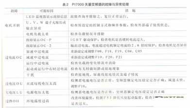 (5)上述調試試驗如有異常,立即查找原因並排除故障PI7000矢量變頻器的故障與異常處理,可見表2