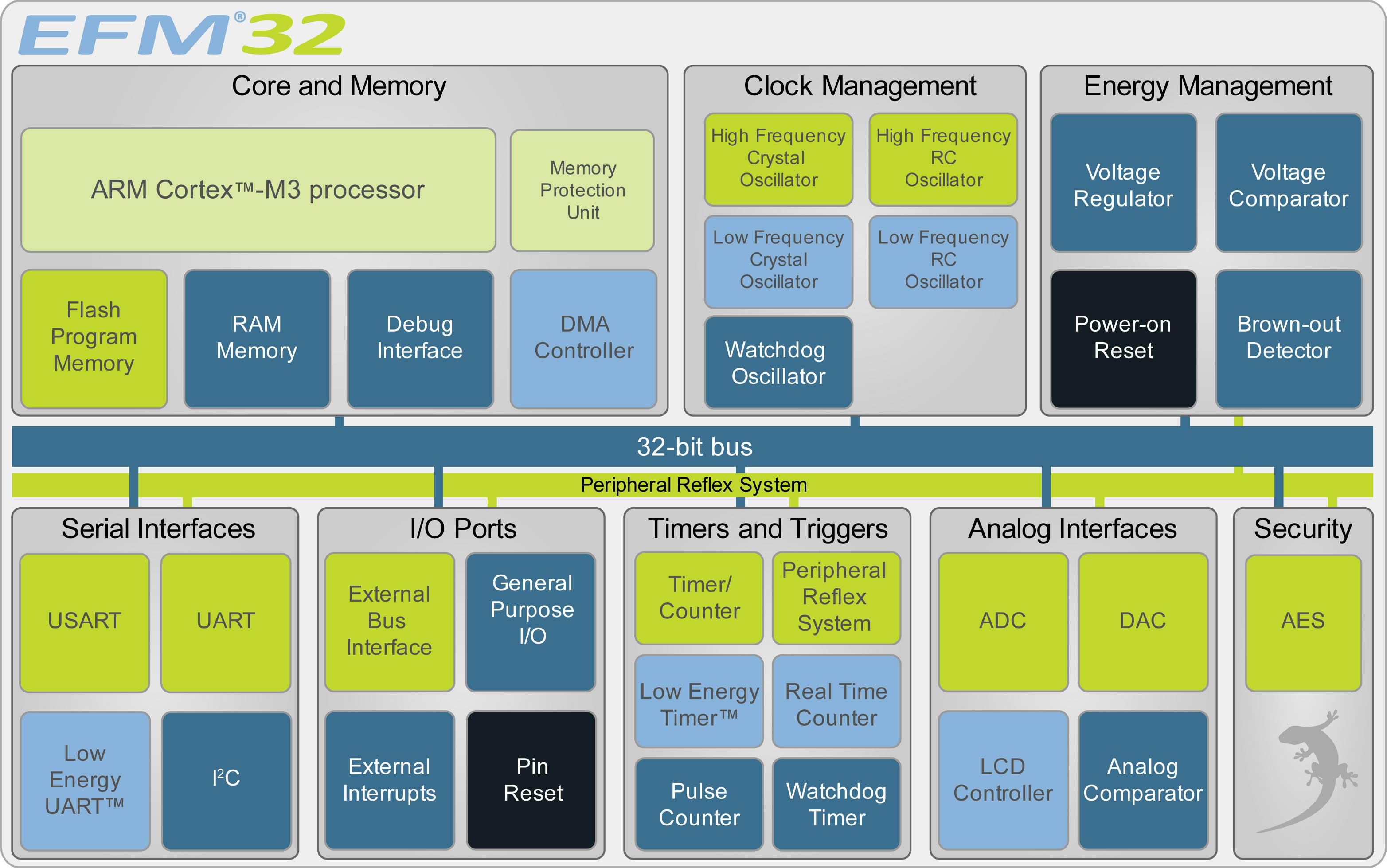 一體化是限製電源的一個重要因素。由於一整套片上外圍設備,Gecko CPU形成了一個有絕對最低的外部元件的係統基礎。其內核包括片上閃存(達128 KB)和RAM(達16 KB),有1係列的串行接口包括UART(標準和低功耗),USARTs和 I2C,其多個數字I / O達到了90個引腳;幾個不同的定時器/計數器模塊也將產生PWM輸出,而模塊包括模擬/數字和數字/模擬轉換器。其它的片上硬件不僅包括一個用來直接驅動1個4x40段顯示器的LCD控製器模塊,也包括一個為AES加密的加速功能。