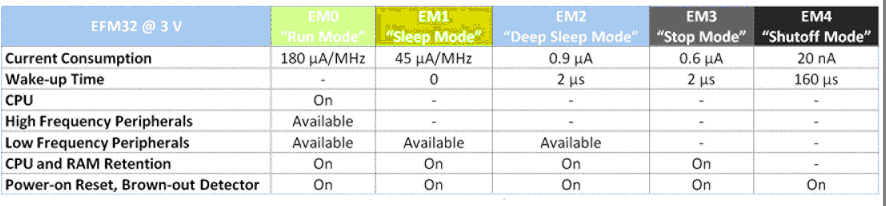 圖3. EFM32 Gecko微控製器的一個關鍵屬性是它提供給用戶的能源模式選擇,例如,在完整的關閉模式中電流消耗僅有20nA,而在深度睡眠模式(保持通電複位、燈光暗淡檢測器、實時時鍾,並保留RAM內容和CPU狀態)下僅有900nA。
