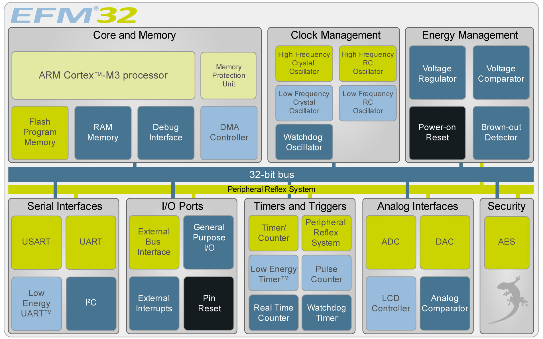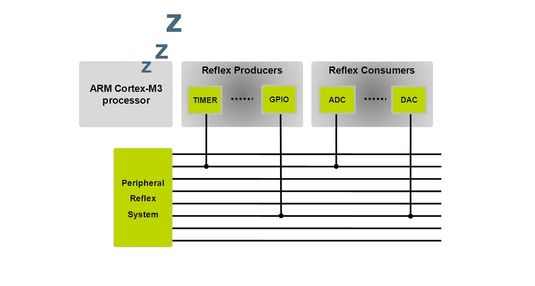 Cortex - M3內核能夠執行軟件中的眾多任務,其低功耗運行決定了某些功能仍可以處理更多的硬件電源效率。 為EFM32開發的外圍設備用於自主運作,無需內核的幹預。使用一個複雜的互連矩陣外圍設備反射係統,EFM32的外圍設備能夠執行不喚醒睡眠模式下內核的相對複雜的功能。 在典型應用中,例如它可能經常使用ADC來進行測量。EFM32具有低水平驅動程序庫的特點,支持Cortex - M3配置自主操作的外圍設備。這樣,一旦配置好了,它們就可以執行許多任務,無需喚醒內核。