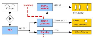 通過上述對傳統LCDTV電源的結構分析,我們不難發現一個問題,即整體效率非常低,因為占70%以上功耗的背光部分電能在PFC之後經曆了降壓再升壓的兩級轉換,且轉換過程中的效率損失也會引起散熱問題。LCDTV的超簿設計及噪音限製使得無法在機箱中添加風扇,而熱量的堆積會直接導致機殼內上下部分溫度不均勻,再加上CCFL亮度對溫度的敏感特性,這樣的設計給用戶呈現出來的將是麵板上下部亮度不均勻的“獨特”效果。[page]