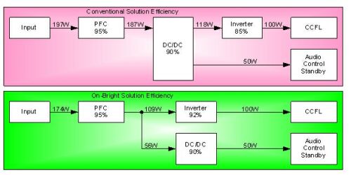 為解決以上問題,昂寶電子運用自身的電源行業經驗及係統研發能力,對傳統LCDTV電源架構進行優化,整合自主開發的PFC、QR、Flyback、Inverter等產品線的控製芯片,成功開發出了應用於大尺寸LCDTV的整體電源解決方案,能夠節省約10%的能耗,並大幅降低電源模塊的製造成本。