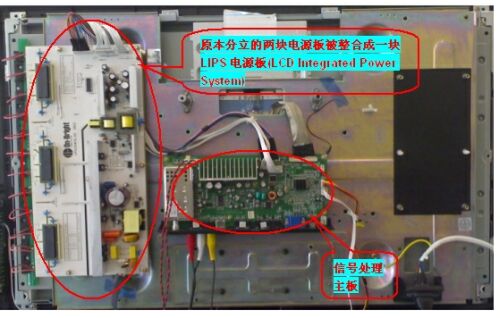 23英寸及以下的小尺寸LCDTV由於整機功率通常小於75W,不需要配置PFC線路,其供電模塊的設計和製造已經相對成熟,早期分立的AC/DC主電源板和DC/AC逆變電源板出於降低製造成本的考慮已經被整合到一塊PCB板上,即目前主流的LIPS(LCDIntegratedPowerSystem)結構,昂寶電子針對此類應用開發了多款LIPS電源,AC/DC部分轉換電路主要使用OB2263、OB2269和OB2202等芯片,DC/AC部分逆變器電路主要采用OB3316、OB3318和OB494P等芯片,小尺寸LCDTV內部隻有電源板和信號處理主板兩塊PCB,而對於32英寸以上大尺寸LCDTV而言,其內部會相對複雜。