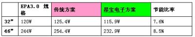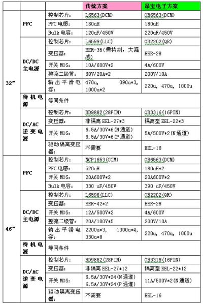以某知名品牌32"與46"LCDTV進行對比,昂寶電子所開發的LCDTV整體電源解決方案在整體功耗及關鍵零件數量方麵均比傳統電源方案有明顯的優勢: