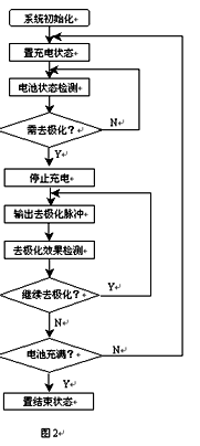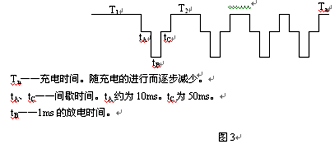 整個係統的控製過程為:蓄電池組開始充電一段時間後,檢測電池電壓,當達到電池出氣點電壓(約2.4V/單體)時,停止充電,然後進行大電流(約2C)放電去極化,時間為1ms,充放電曲線如圖3所suo示shi。放fang電dian後hou,再zai檢jian測ce電dian池chi狀zhuang態tai,進jin行xing去qu極ji化hua效xiao果guo檢jian測ce,達da到dao去qu極ji化hua效xiao果guo則ze回hui轉zhuan充chong電dian,否fou則ze,再zai次ci進jin行xing去qu極ji化hua放fang電dian,直zhi至zhi達da到dao去qu極ji化hua要yao求qiu的de效xiao果guo才cai回hui轉zhuan充chong電dian。如ru果guo連lian續xu放fang電diann次(n=3),電池電壓變化很小,則充電完成並結束充電狀態。