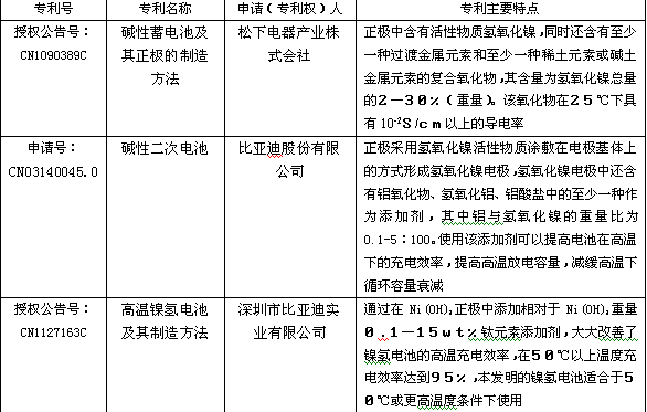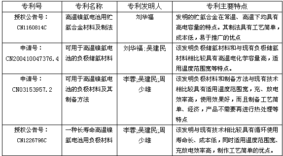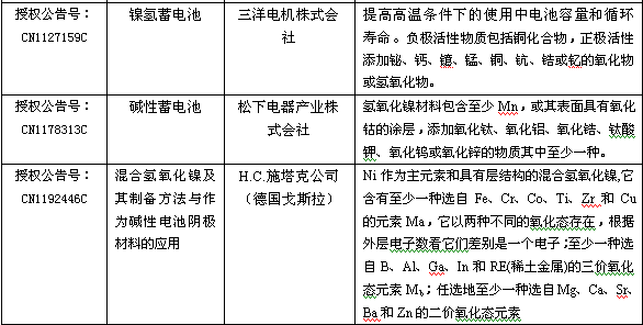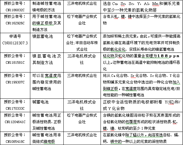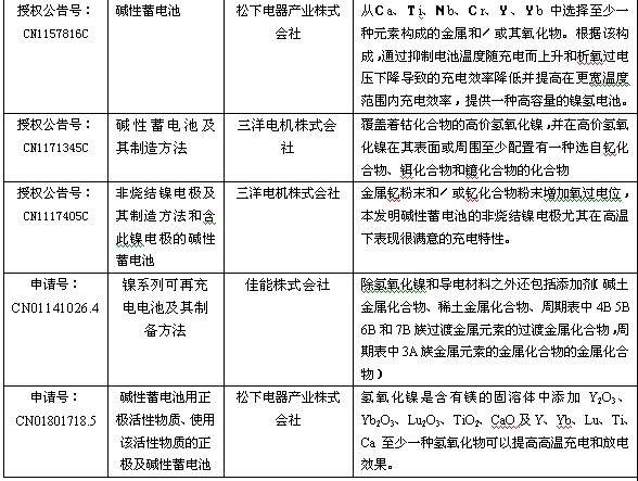 在電池配料時,通過機械混合法添加周期表中ⅡA、ⅢB、ⅣB、ⅦB、ⅧB、ⅡB主族元素和3、4、5周期的元素、氧化物或氫氧化物,能較好地提高或改善鎳氫高溫性能。世界著名電池製造公司在華申請授權的專利中多有介紹,如日本鬆下、三洋;中國比亞迪;德國H.C.施塔克等公司。詳細見下表: